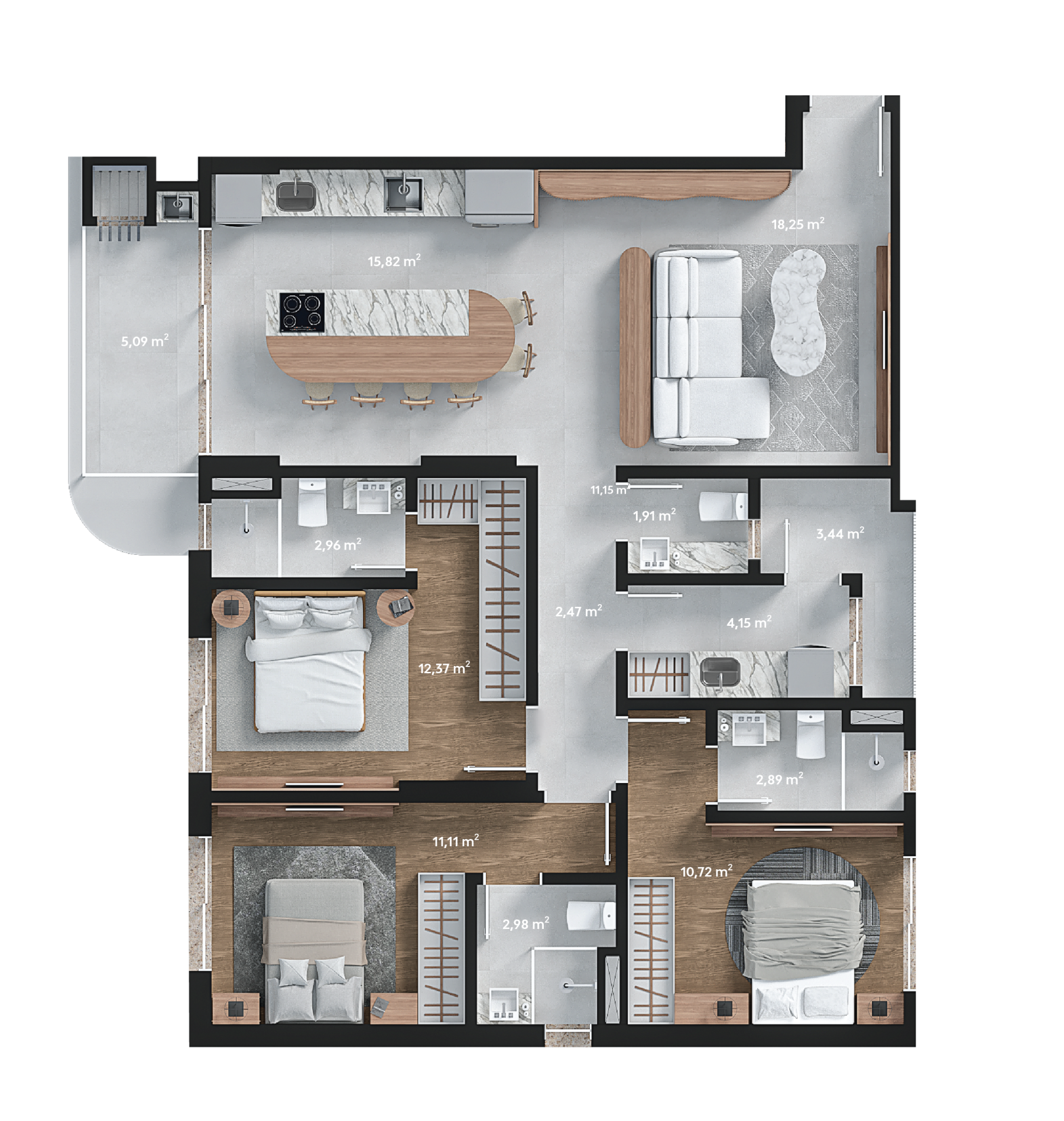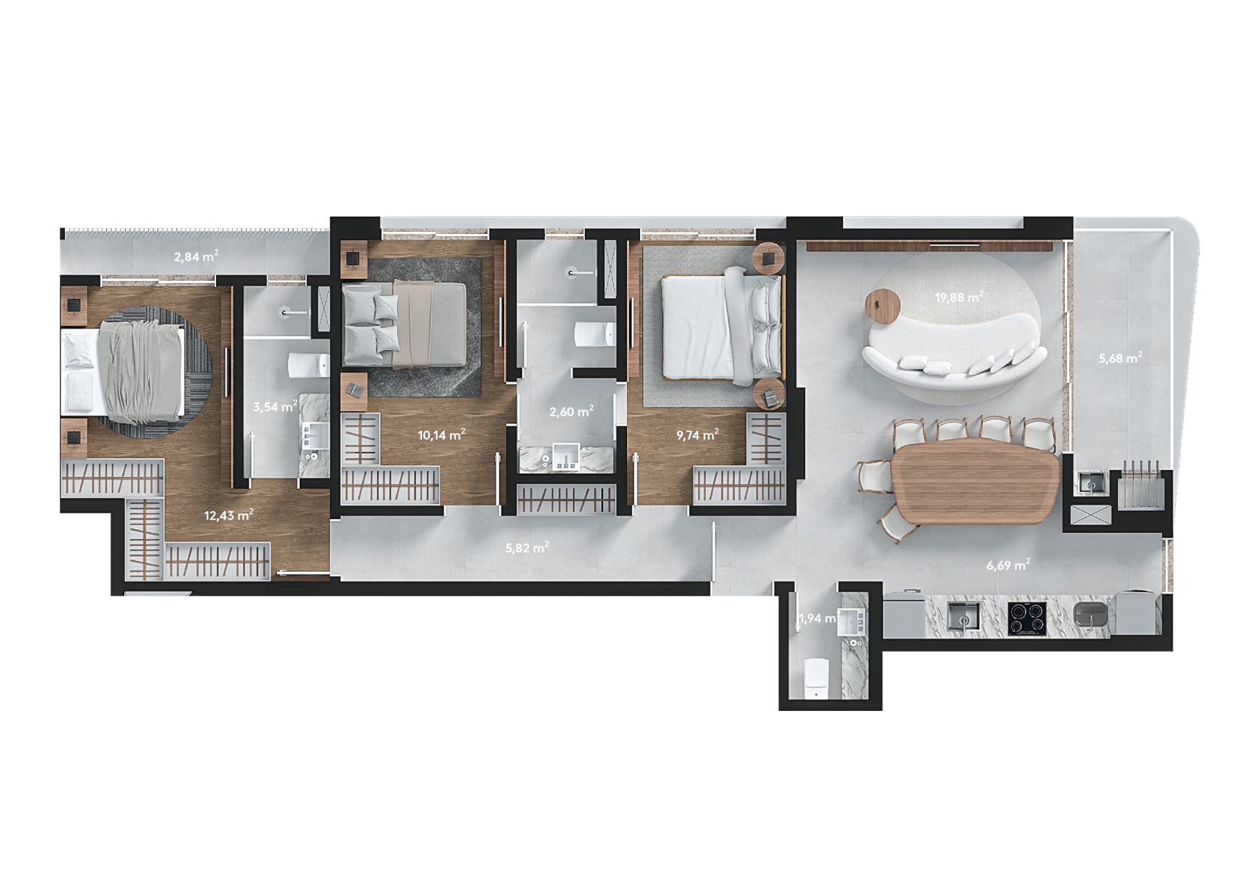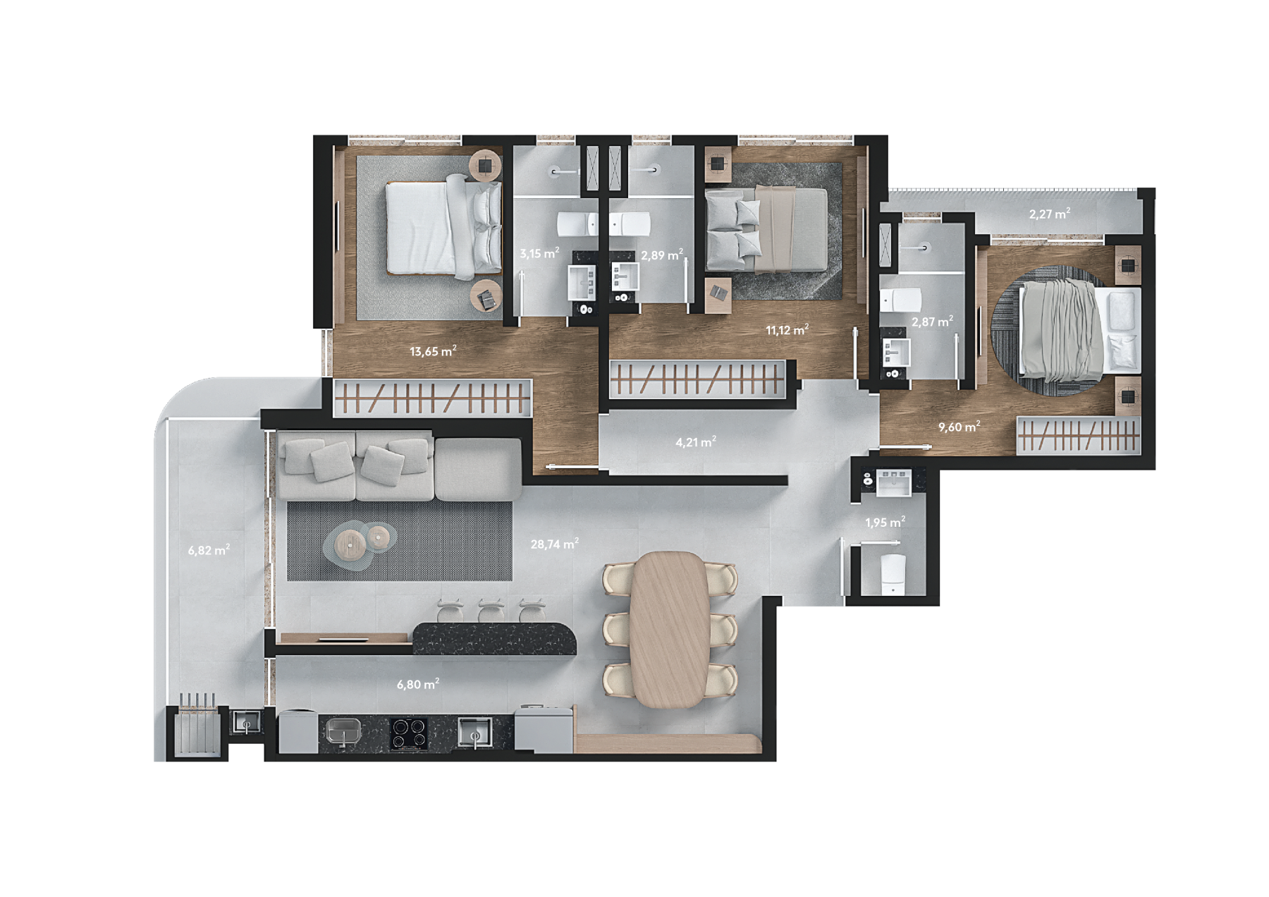 Apartamentos com plantas versáteis e ambientes integrados, oferecendo conforto e privacidade em opções de 1 a 3 suítes.